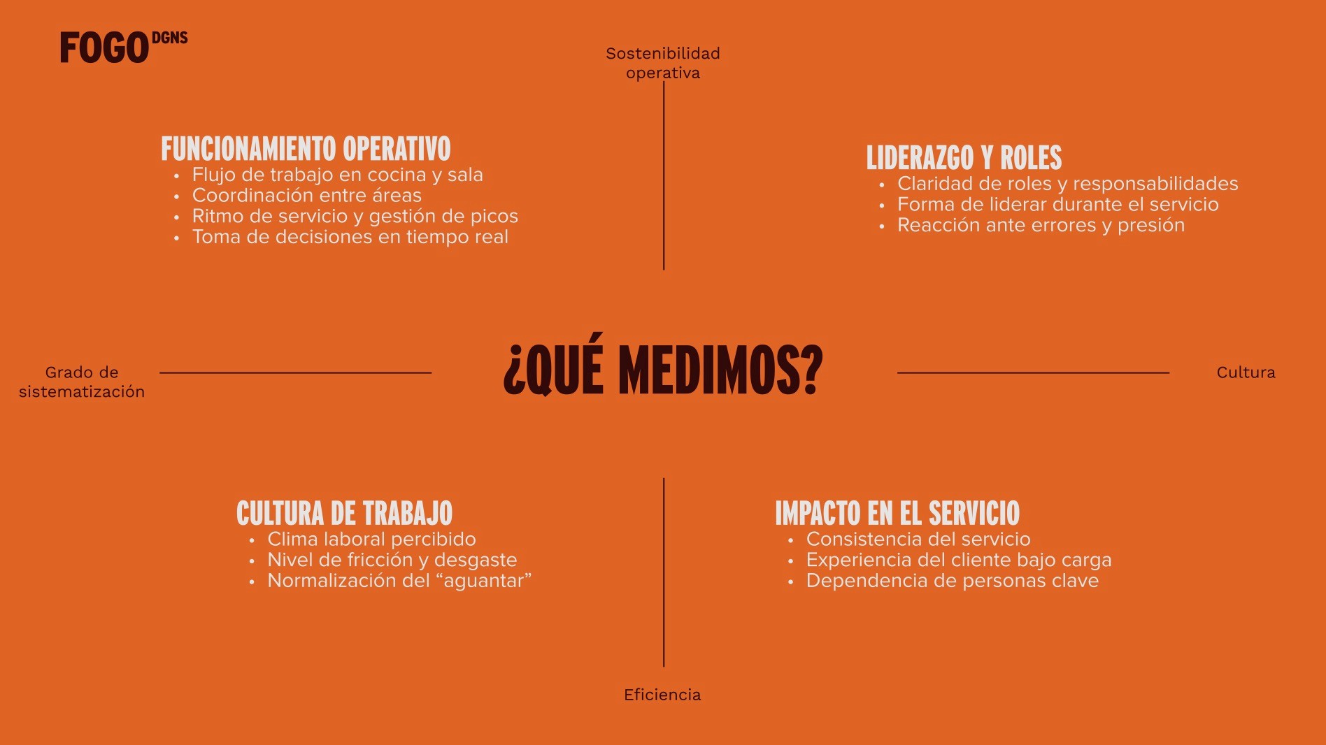 FOGO diagnostics es un diagnóstico operativo y cultural aplicado a la operación real del restaurante. Permite entender cómo funciona hoy la organización y dónde se están generando fricciones que impactan en el equipo, el servicio y los resultados. A partir del diagnóstico, se definen prioridades claras de intervención para ordenar la forma de trabajar y sostener los resultados en el tiempo.